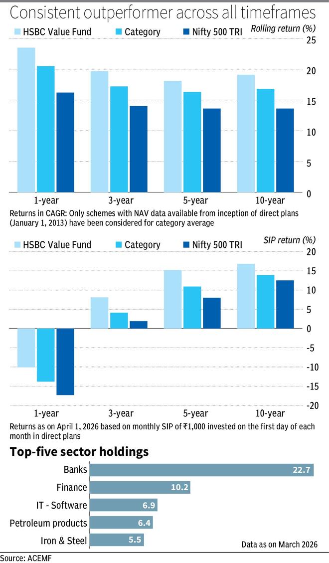 The scheme has been equally impressive for SIP investors. A monthly SIP over 10 years has generated returns of 16.8 per cent, compared with 12.5 per cent from the Nifty 500 TRI and 13.9 per cent for the value-fund category average. Even over five years, the fund’s SIP return of 15.2 per cent is far ahead of the benchmark’s 8 per cent and category’s 10.9 per cent.